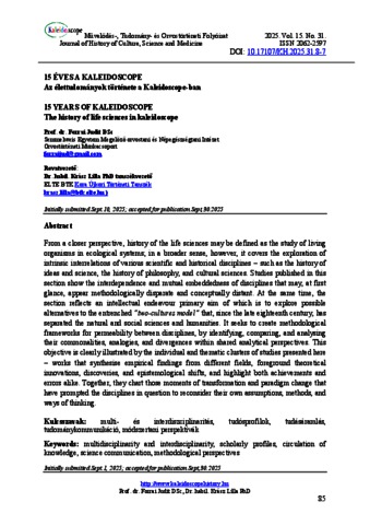 Forrai, Judit and Krász, Lilla (2025) Az élettudományok története a Kaleidoscope-ban. KALEIDOSCOPE: MŰVELŐDÉS- TUDOMÁNY- ÉS ORVOSTÖRTÉNETI FOLYÓIRAT, 15 (31). pp. 85-98. ISSN 2062-2597