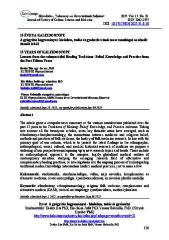 Deáky, Zita and Kis-Halas, Judit and Vámos, Gabriella (2025) A gyógyítás hagyományai: hiedelem, tudás és gyakorlat című rovat tanulságai az elmúlt tizenöt évből. KALEIDOSCOPE: MŰVELŐDÉS- TUDOMÁNY- ÉS ORVOSTÖRTÉNETI FOLYÓIRAT, 15 (31). pp. 126-138. ISSN 2062-2597
