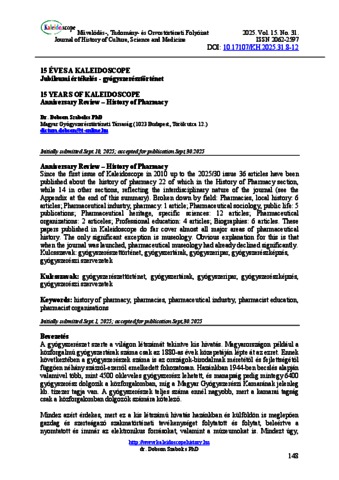 Dobson, Szabolcs (2025) Jubileumi értékelés - gyógyszerésztörténet. KALEIDOSCOPE: MŰVELŐDÉS- TUDOMÁNY- ÉS ORVOSTÖRTÉNETI FOLYÓIRAT, 15 (31). pp. 148-160. ISSN 2062-2597