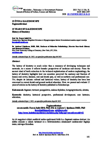 Forrai, Judit and Andrew I., Spielman (2025) Fogászattörténet. KALEIDOSCOPE: MŰVELŐDÉS- TUDOMÁNY- ÉS ORVOSTÖRTÉNETI FOLYÓIRAT, 15 (31). pp. 161-167. ISSN 2062-2597