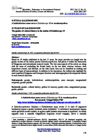 Czingel, Szilvia and Svégel, Fanny (2025) A kultúrtörténet neme rovat a Kaleidoscope 15 év tanulmányaiban. KALEIDOSCOPE: MŰVELŐDÉS- TUDOMÁNY- ÉS ORVOSTÖRTÉNETI FOLYÓIRAT, 15 (31). pp. 178-190. ISSN 2062-2597