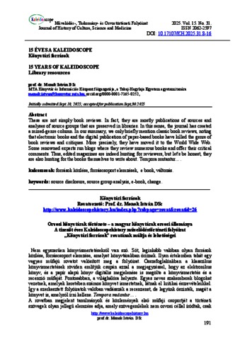 Monok, István (2025) Könyvtári források. KALEIDOSCOPE: MŰVELŐDÉS- TUDOMÁNY- ÉS ORVOSTÖRTÉNETI FOLYÓIRAT, 15 (31). pp. 191-196. ISSN 2062-2597
