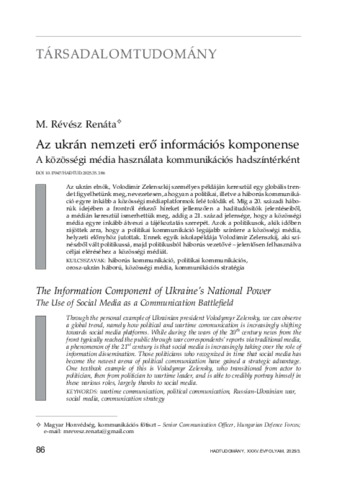 Révész, M. Renáta (2025) Az ukrán nemzeti erő információs komponense : A közösségi média használata kommunikációs hadszíntérként. HADTUDOMÁNY: A MAGYAR HADTUDOMÁNYI TÁRSASÁG FOLYÓIRATA, 35 (3). pp. 86-105. ISSN 1215-4121