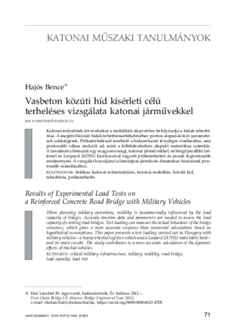 Katonai mûveletek tervezésekor a mobilitást alapvetõen befolyásolja a hidak teherbí-rása. A meglévõ közúti hidak teherbírásértékeléséhez pontos alapadatok és paraméte-rek szükségesek. Próbaterheléssel mérhetõ a hídszerkezet tényleges viselkedése, amipontosabb válasz reakciót ad, mint a feltételezéseken alapuló numerikus számítás.A tanulmány bemutat egy magyarországi, katonai jármûvekkel, nehézgépszállító tré-lerrel és Leopard 2A7HU harckocsival végzett próbaterhelést és annak legfontosabberedményeit. A vizsgálat hozzájárul a lánctalpas jármûvek dinamikus hatásának pon-tosabb számításához.