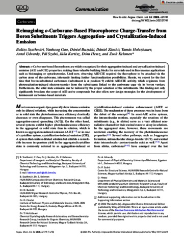 Szathmári, Balázs and Gao, Yanhong and Buzsáki, Dániel and Zámbó, Dániel and Holczbauer, Tamás and Udvardy, Antal and Szabó, Pál and Szilágyiné Kertész, Júlia and Hessz, Dóra and Kelemen, Zsolt (2026) Reimagining o ‐Carborane‐Based Fluorophores: Charge‐Transfer from Boron Substituents Triggers Aggregation‐ and Crystallization‐Induced Emission. ANGEWANDTE CHEMIE-INTERNATIONAL EDITION, in pre. No. e21741. ISSN 1433-7851 (In Press)