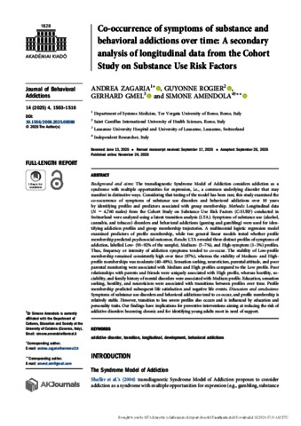 Zagaria, Andrea and Rogier, Guyonne and Gmel, Gerhard and Amendola, Simone (2025) Co-occurrence of symptoms of substance and behavioral addictions over time: A secondary analysis of longitudinal data from the Cohort Study on Substance Use Risk Factors. JOURNAL OF BEHAVIORAL ADDICTIONS, 14 (4). pp. 1503-1516. ISSN 2062-5871