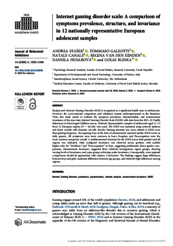 Stasek, Andrea and Galeotti, Tommaso and Canale, Natale and Van Den Eijnden, Regina and Husarova, Daniela and Blinka, Lukas (2025) Internet gaming disorder scale: A comparison of symptoms prevalence, structure, and invariance in 12 nationally representative European adolescent samples. JOURNAL OF BEHAVIORAL ADDICTIONS, 14 (4). pp. 1533-1545. ISSN 2062-5871