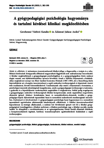 Gerebenné Várbíró, Katalin and Ádámné Juhász, Anikó (2025) A gyógypedagógiai pszichológia hagyománya és tartalmi kérdései klinikai megközelítésben = The tradition and content of psychology of special education in a clinical approach. MAGYAR PSZICHOLÓGIAI SZEMLE, 80 (3). pp. 382-395. ISSN 0025-0279