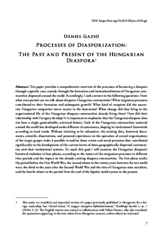 Gazsó, Dániel (2024) Processes of Diasporization: The Past and Present of the Hungarian Diaspora. HUNGARIAN JOURNAL OF MINORITY STUDIES, 7. pp. 7-34. ISSN 2560-080X