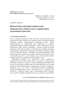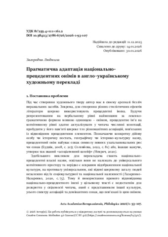 Zahorodnia, Liudmyla (2026) Прагматична адаптація національно-прецедентних онімів в англо–українському художньому перекладі = A kultúraspecifikus tulajdonnevek pragmatikai adaptációja az angol–ukrán műfordításban. ACTA ACADEMIAE BEREGSASIENSIS, PHILOLOGICA, 5 (1). pp. 93-107. ISSN 27866718
