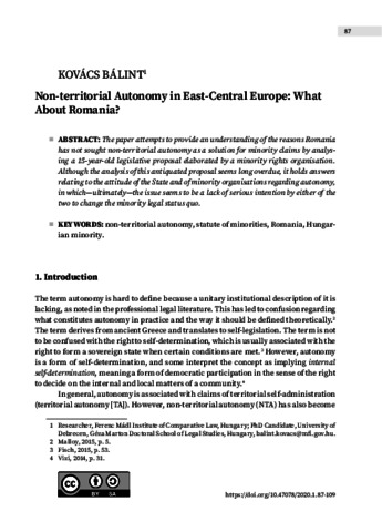 Kovács, Bálint (2020) Non-territorial Autonomy in East-Central Europe: What About Romania? CENTRAL EUROPEAN JOURNAL OF COMPARATIVE LAW, 1 (1). pp. 87-109. ISSN 2732-0707