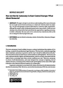 The paper attempts to provide an understanding of the reasons Romania has not sought non-territorial autonomy as a solution for minority claims by analysing a 15-year-old legislative proposal elaborated by a minority rights organisation. Although the analysis of this antiquated proposal seems long overdue, it holds answers relating to the attitude of the State and of minority organisations regarding autonomy, in which—ultimately—the issue seems to be a lack of serious intention by either of the two to change the minority legal status quo.