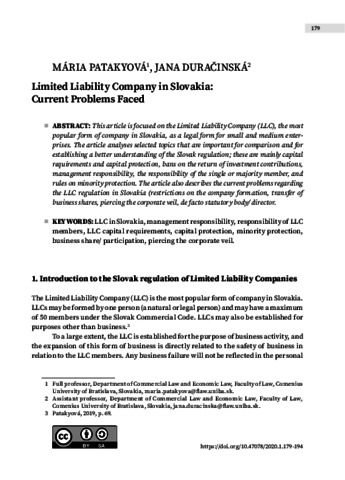 Patakyová, Mária and Duračinská, Jana (2020) Limited Liability Company in Slovakia: Current Problems Faced. CENTRAL EUROPEAN JOURNAL OF COMPARATIVE LAW, 1 (1). pp. 179-194. ISSN 2732-0707