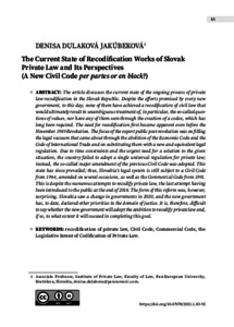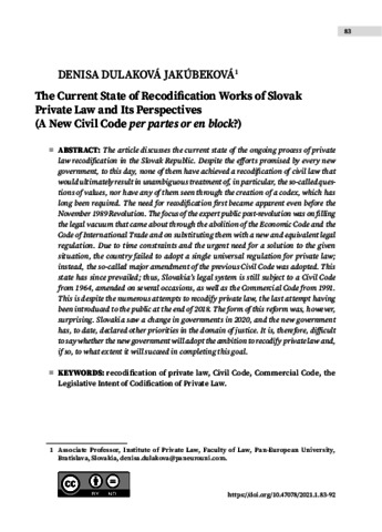 The article discusses the current state of the ongoing process of private law recodification in the Slovak Republic. Despite the efforts promised by every new government, to this day, none of them have achieved a recodification of civil law that would ultimately result in unambiguous treatment of, in particular, the so-called questions of values, nor have any of them seen through the creation of a codex, which has long been required. The need for recodification first became apparent even before the November 1989 Revolution. The focus of the expert public post-revolution was on filling the legal vacuum that came about through the abolition of the Economic Code and the Code of International Trade and on substituting them with a new and equivalent legal regulation. Due to time constraints and the urgent need for a solution to the given situation, the country failed to adopt a single universal regulation for private law; instead, the so-called major amendment of the previous Civil Code was adopted. This state has since prevailed; thus, Slovakia’s legal system is still subject to a Civil Code from 1964, amended on several occasions, as well as the Commercial Code from 1991. This is despite the numerous attempts to recodify private law, the last attempt having been introduced to the public at the end of 2018. The form of this reform was, however, surprising. Slovakia saw a change in governments in 2020, and the new government has, to date, declared other priorities in the domain of justice. It is, therefore, difficult to say whether the new government will adopt the ambition to recodify private law and, if so, to what extent it will succeed in completing this goal.