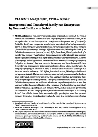 Marjanski, Vladimir and Dudás, Attila (2021) Intergenerational Transfer of Family-run Enterprises by Means of Civil Law in Serbia. CENTRAL EUROPEAN JOURNAL OF COMPARATIVE LAW, 2 (1). pp. 119-137. ISSN 2732-0707