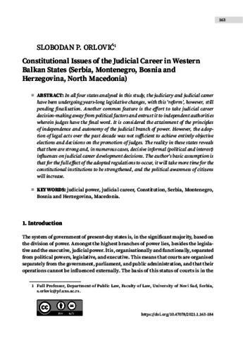 Constitutional Issues of the Judicial Career in Western Balkan States (Serbia, Montenegro, Bosnia and Herzegovina, North Macedonia)