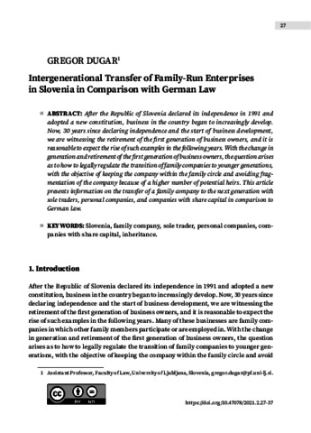 Dugar, Gregor (2021) Intergenerational Transfer of Family-Run Enterprises in Slovenia in Comparison with German Law. CENTRAL EUROPEAN JOURNAL OF COMPARATIVE LAW, 2 (2). pp. 27-37. ISSN 2732-0707