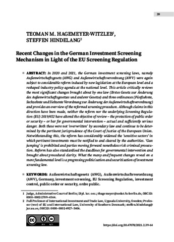 Hagemeyer-Witzleb, Teoman M. and Hindelang, Steffen (2021) Recent Changes in the German Investment Screening Mechanism in Light of the EU Screening Regulation. CENTRAL EUROPEAN JOURNAL OF COMPARATIVE LAW, 2 (2). pp. 39-64. ISSN 2732-0707