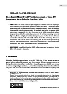 This article uses an analytical approach in order to dissect the major legal issues concerning the enforcement of intra-EU awards post-Brexit. The outcomes of the enforcement cases will depend on the country where enforcement is sought (EU Member States, the UK, and other third countries), the applicable legal regime pursuant to which enforcement is sought (the New York Convention or the ICSID Convention), various temporal factors (whether certain key moments in the arbitral proceedings occurred before or after the end of the Brexit transition period), and whether the intra-EU cases are based on intra-EU BITs or the ECT, or both. Due to this complexity, there is no easy answer as to how the various issues arising from the post-Brexit enforcement of intra-EU awards should be solved. This is most unfortunate as it creates uncertainty for investors, host States, and national courts of enforcement alike.