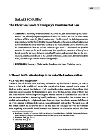 Schanda, Balázs (2022) The Christian Roots of Hungary’s Fundamental Law. CENTRAL EUROPEAN JOURNAL OF COMPARATIVE LAW, 3 (1). pp. 195-202. ISSN 2732-0707