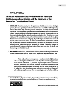 The article starts from the hypothesis, which it seeks to prove, that legal systems, laws and especially constitutions are not value-neutral but rather defined by values. These values may be moral, political or religious. In Europe and the Western civilisation, a significant part of these values has been shaped by the Christian religion, culture, outlook on life and behaviour. As a narrower context, the article focuses on the moral and political values of the Romanian constitution, their Christian spirit and origin, and the related theoretical and constitutional interpretations. In the analysis, the author concentrates on human dignity, the free development of the human personality, and justice as the main values, as well as the fundamental rights related to them and the principles that define the organisation of the state. The influence of Christian values, thinking and perceptions can be seen in all of these. The author analyses in particular the Christian constitutional and civil law rules governing the family and the marriage on which it is based.