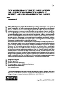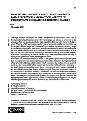 Barzó, Tímea (2021) From Marital Property Law To Family Property Law : Theoretical and Practical Aspects of Property Law Regulations Protecting Families. LAW IDENTITY AND VALUES, 1 (1). pp. 23-39. ISSN 2786-2542