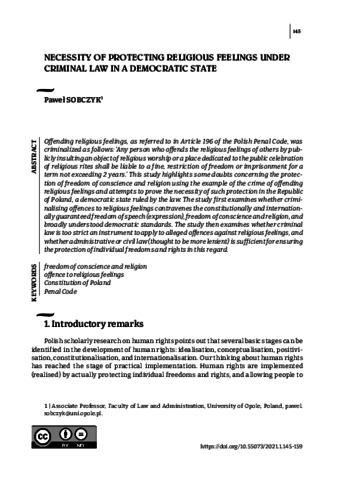 Sobczyk, Pawel (2021) Necessity of Protecting Religious Feelings under Criminal Law in a Democratic State. LAW IDENTITY AND VALUES, 1 (1). pp. 145-159. ISSN 2786-2542