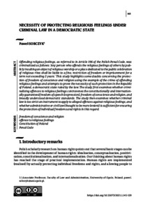 Offending religious feelings, as referred to in Article 196 of the Polish Penal Code, was criminalized as follows: ‘Any person who offends the religious feelings of others by publicly insulting an object of religious worship or a place dedicated to the public celebration of religious rites shall be liable to a fine, restriction of freedom or imprisonment for a term not exceeding 2 years.’ This study highlights some doubts concerning the protection of freedom of conscience and religion using the example of the crime of offending religious feelings and attempts to prove the necessity of such protection in the Republic of Poland, a democratic state ruled by the law. The study first examines whether criminalising offences to religious feelings contravenes the constitutionally and internationally guaranteed freedom of speech (expression), freedom of conscience and religion, and broadly understood democratic standards. The study then examines whether criminal law is too strict an instrument to apply to alleged offences against religious feelings, and whether administrative or civil law (thought to be more lenient) is sufficient for ensuring the protection of individual freedoms and rights in this regard.