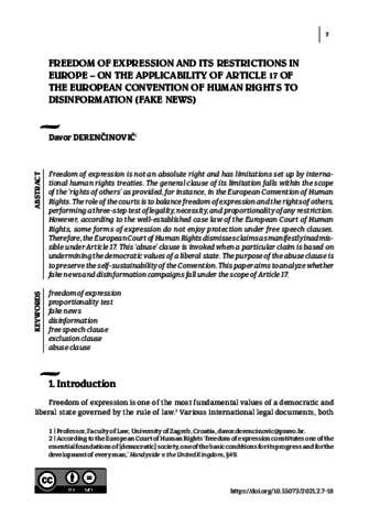 Freedom of expression is not an absolute right and has limitations set up by international human rights treaties. The general clause of its limitation falls within the scope of the ‘rights of others’ as provided, for instance, in the European Convention of Human Rights. The role of the courts is to balance freedom of expression and the rights of others, performing a three-step test of legality, necessity, and proportionality of any restriction. However, according to the well-established case law of the European Court of Human Rights, some forms of expression do not enjoy protection under free speech clauses. Therefore, the European Court of Human Rights dismisses claims as manifestly inadmissible under Article 17. This ‘abuse’ clause is invoked when a particular claim is based on undermining the democratic values of a liberal state. The purpose of the abuse clause is to preserve the self-sustainability of the Convention. This paper aims to analyze whether fake news and disinformation campaigns fall under the scope of Article 17.