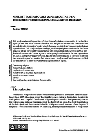 Đukić, Dalibor (2021) Nihil Est Tam Inaequale Quam Aequitas Ipsa: The Issue of Confessional Communities in Serbia. LAW IDENTITY AND VALUES, 1 (2). pp. 19-32. ISSN 2786-2542