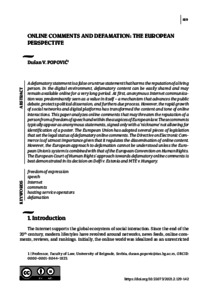 A defamatory statement is a false or untrue statement that harms the reputation of a living person. In the digital environment, defamatory content can be easily shared and may remain available online for a very long period. At first, anonymous Internet communication was predominantly seen as a value in itself – a mechanism that advances the public debate, protects political dissension, and furthers due process. However, the rapid growth of social networks and digital platforms has transformed the content and tone of online interactions. This paper analyzes online comments that may threaten the reputation of a person from a freedom of speech and within the auspices of European law. These comments typically appear as anonymous statements, signed only with a ‘nickname’ not allowing for identification of a poster. The European Union has adopted several pieces of legislation that set the legal status of defamatory online comments. The Directive on Electronic Commerce is of utmost importance given that it regulates the dissemination of online content. However, the European approach to defamation cannot be understood unless the European Union’s system is combined with that of the European Convention on Human Rights. The European Court of Human Rights’ approach towards defamatory online comments is best demonstrated in its decision on Delfi v. Estonia and MTE v. Hungary.