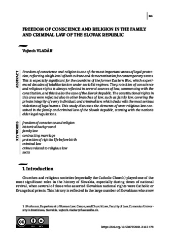 Freedom of conscience and religion is one of the most important areas of legal protection, reflecting a high level of both culture and democratization for contemporary states. This is especially significant for the countries of the former Eastern Bloc, which experienced decades of totalitarianism under socialist regimes. The protection of conscience and religious rights is always reflected in several sources of law, commencing with the constitution, and this is also the case of the Slovak Republic. The constitutional rights in this area were reflected also in other branches of law, such as family law, covering the private integrity of every individual, and criminal law, which deals with the most serious violations of legal norms. This study discusses the elements of state religious law contained in the family and criminal law of the Slovak Republic, starting with the nation’s older legal regulations.
