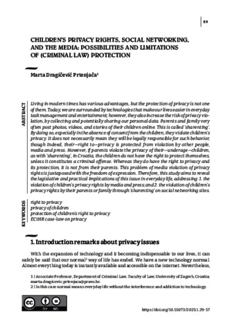 Dragičević Prtenjača, Marta (2023) Children’s Privacy Rights, Social Networking, and the Media: Possibilities and Limitations of (Criminal Law) Protection. LAW IDENTITY AND VALUES, 3 (1). pp. 29-57. ISSN 2786-2542