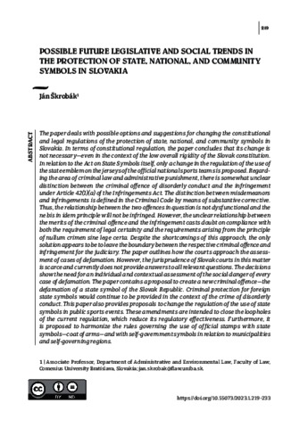 Škrobák, Ján (2023) Possible Future Legislative and Social Trends in the Protection of State, National, and Community Symbols in Slovakia. LAW IDENTITY AND VALUES, 3 (1). pp. 219-233. ISSN 2786-2542