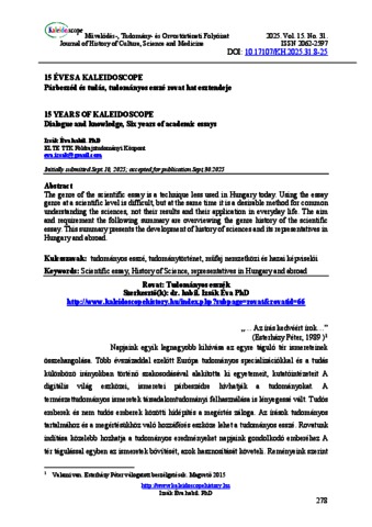 Izsák, Éva (2025) Párbeszéd és tudás, tudományos esszé rovat hat esztendeje. KALEIDOSCOPE: MŰVELŐDÉS- TUDOMÁNY- ÉS ORVOSTÖRTÉNETI FOLYÓIRAT, 15 (31). pp. 278-284. ISSN 2062-2597