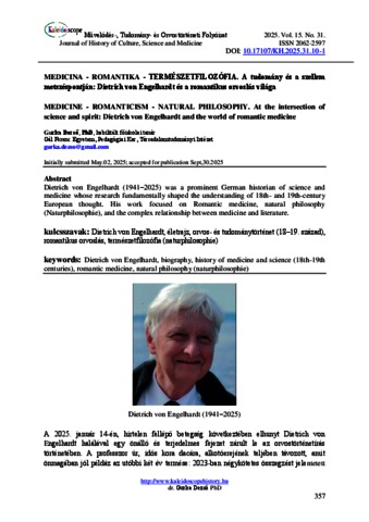 Gurka, Dezső (2025) A tudomány és a szellem metszéspontján: Dietrich von Engelhardt és a romantikus orvoslás világa. KALEIDOSCOPE: MŰVELŐDÉS- TUDOMÁNY- ÉS ORVOSTÖRTÉNETI FOLYÓIRAT, 15 (31). pp. 357-390. ISSN 2062-2597
