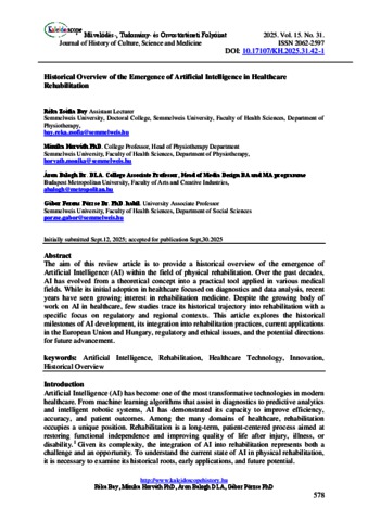 Bay, Réka Zsófia and Horváth, Mónika and Balogh, Áron and Pörzse, Gábor Ferenc (2025) Historical Overview of the Emergence of Artificial Intelligence in Healthcare Rehabilitation. KALEIDOSCOPE: MŰVELŐDÉS- TUDOMÁNY- ÉS ORVOSTÖRTÉNETI FOLYÓIRAT, 15 (31). pp. 578-599. ISSN 2062-2597 (Unpublished)
