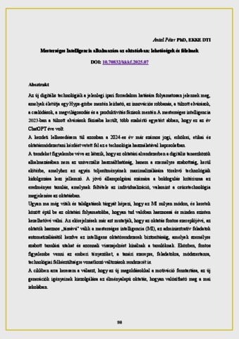 Antal, Péter (2025) Mesterséges Intelligencia alkalmazása az oktatásban: lehetőségek és félelmek. In: Kortárs Kihívások a Köznevelésben és a Felsőoktatásban Nemzetközi Konferencia. Miskolci Egyetem, Miskolc-Egyetemváros, pp. 98-117.