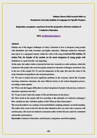 Oravecz, Adrienn (2025) Integration, acceptance, experience from the perspective of former students of Conductive Education. In: Kortárs Kihívások a Köznevelésben és a Felsőoktatásban Nemzetközi Konferencia. Miskolci Egyetem, Miskolc-Egyetemváros, pp. 458-467.