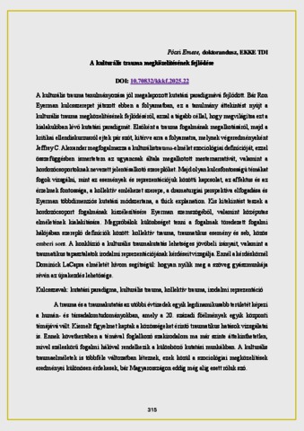 Pócsi, Emese (2025) A kulturális trauma megközelítésének fejlődése. In: Kortárs Kihívások a Köznevelésben és a Felsőoktatásban Nemzetközi Konferencia. Miskolci Egyetem, Miskolc-Egyetemváros, pp. 315-323.