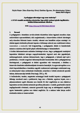 Polyák-Pásztor, Diána (2025) A pedagógus szövetséges vagy rossz tanítvány? A BTMN-tanulók neveléséhez-oktatásához kapcsolódó szakmai ajánlás implikációi a kritikai diskurzuselemzés tükrében. In: Kortárs Kihívások a Köznevelésben és a Felsőoktatásban Nemzetközi Konferencia. Miskolci Egyetem, Miskolc-Egyetemváros, pp. 42-56.