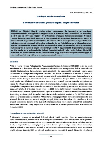 2002-től az Oktatási Hivatal minden évben megszervezi és lebonyolítja az országos kompetenciamérést szövegértés-szövegalkotásból és matematikai eszköztudásból. A tanulmány a 2010-ben és 2011-ben végzett 10. évfolyamos országos kompetenciamérések fővárosi fenntartású oktatási intézményekre vonatkozó szövegértés-szövegalkotás eredményeit elemzi a nemek szerinti megoszlás szempontjából. Az elemzés kitér a szövegtípusok és a gondolkodási műveletek szerinti eltérések jellemzőire, a képzési forma (iskolatípus) és a képességszintek szerinti különbségekre. A két év mérései alapján egyértelműen körvonalazódik, hogy szignifikáns különbség van a fiúk és a lányok teljesítménye között. A legjellemzőbb teljesítménykülönbség az értelmezést és a szövegalkotást igénylő feladatok területén jelentkezik. Néhány kivételtől eltekintve az összes kérdést közel azonos szinten vagy magas százalékpont-különbséggel a lányok válaszolták meg jobban a kompetenciamérések során.