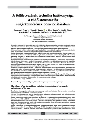 Gosztonyi, Petra and Ungvári, Tamás and Béres, Tamás and Szabó, Döme and Kiss, Balázs and Dankovics, Zsófia and Olajos, Judit (2026) A felületvezérelt technika hatékonysága a tüdő stereotaxiás sugárkezelésének pozicionálásában = The efficacy of surface-guidance technique in positioning of stereotactic radiotherapy of the lung. ORVOSI HETILAP, 167 (5). pp. 171-179. ISSN 0030-6002