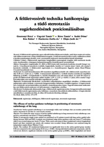 Bevezetés: A felületvezérelt sugárterápia egyre szélesebb körben alkalmazott technika, amely képes noninvazív módon, valós időben monitorozni a beteg testfelszínének mozgását. A tüdő stereotaxiás kezelése esetén a milliméteres eltérés is kezelési pontatlanságot okozhat, ezért a pozicionálási módszerek összehasonlítása kiemelt jelentőségű. Célkitűzés: Célunk a felületvezérelt sugárterápia betegbeállítási pontosságának vizsgálata tüdő stereotaxiás kezelés során, összehasonlítva a kúpsugaras komputertomográfiás (kontrollcsoport) pozicionálással. Módszer: Retrospektív vizsgálatunkba 12, 2022 és 2025 között tüdő stereotaxiás kezelésben részesült beteget vontunk be. A kezelőasztal transzlációs (vertikális, longitudinális, laterális) és 3 rotációs irányú (’pitch, roll, rotation’) korrekcióit értékeltük. A felületvezérelt sugárterápiás és a kontrollcsoportot független mintás Mann–Whitney U-teszttel hasonlítottuk össze. Eredmények: Az eredő háromdimenziós (3D) transzláció szignifikánsan kisebb volt a felületvezérelt csoportban (medián: 0,40 cm vs. 0,63 cm; p = 0,002). A komponensek tekintetében a vertikális irányban mutatkozott szignifikáns különbség (p<0,001). A longitudinális és a laterális eltolódásban nem volt érdemi eltérés. Az eredő 3D rotáció nagyobb volt felületvezérelt sugárterápia mellett (medián: 2,19° vs. 1,13°; p = 0,013). A ’pitch, roll és rotation’ tengelyek külön-külön nem mutattak statisztikai szignifikanciát (p>0,05). Megbeszélés: Eredményeink illeszkednek a nemzetközi szakirodalomban megtalálható adatokhoz. A felületvezérelt sugárterápiás eszköz javíthatja a stereotaxiás betegpozicionálást, különösen a vertikális tengelyen. A forgási irányokban a korrekciók viszont kismértékben növekedtek a kontrollcsoporthoz képest. Nagyobb mintaszámú multicentrikus, más felületvezérelt rendszerre is ki kell terjeszteni a vizsgálatokat a jövőben. Következtetés: Eredményeink alátámasztják, hogy a felületvezérelt sugárterápia javítja a betegpozicionálás pontosságát a tüdő felületvezérelt sugárterápiája során, különösen a transzlációs elmozdulások csökkentésében. A forgási eltérések mérséklésében is mutatkozott előny, de ehhez 6D korrekciós lehetőség szükséges. Orv Hetil. 2026; 167(5): 171–179. | Introduction: Surface-guided radiotherapy is an increasingly widely used technique that can monitor patient body surface movement in real time in a non-invasive manner. Objective: To evaluate the setup accuracy of surface-guided radiotherapy in lung stereotactic body radiotherapy com- pared to conventional cone-beam CT-based positioning. Method: A retrospective single-center analysis was performed on 12 patients treated with lung surface-guided radio- therapy between 2022 and 2025. 6 patients were positioned using surface guidance with cone beam CT verification, while 6 were treated using cone-beam CT alone. Table couch corrections in three translational (vertical, longitudinal, lateral) and three rotational axes (pitch, roll, rotation) were recorded. Group differences were analyzed using the independent-samples Mann–Whitney U-test. Results: The resultant 3D translational displacement was significantly lower in the surface-guided group (median: 0.40 cm) compared to the control group (0.63 cm; p = 0.002). Among individual translational components, only the vertical axis showed a significant reduction in the surface-guided group (p<0.001), while longitudinal and lateral shifts did not differ significantly (p>0.05). In contrast, the resultant 3D rotational displacement was higher with surface-guided radiotherapy (median: 2.19° vs. 1.13°; p = 0.013). None of the individual rotational axes (pitch, roll, rotation) showed statistically significant differences (p>0.05). Discussion: These findings are consistent with previous literature demonstrating that surface guidance improves trans- lational accuracy in thoracic radiotherapy, particularly in the vertical direction. The slightly increased rotational de- viations observed in the surface-guided group may be attributed to the absence of a 6D treatment couch, as the system primarily optimizes translational alignment. Given the small sample size, further multicenter studies with larger cohorts and different surface guidance platforms are warranted. Conclusion: Surface-guided radiotherapy enhances positioning accuracy in lung sterotactic radiotherapy, mainly by reducing translational displacements. However, optimal control of rotational errors may require the integration of 6D couch capabilities or dedicated rotational correction techniques.