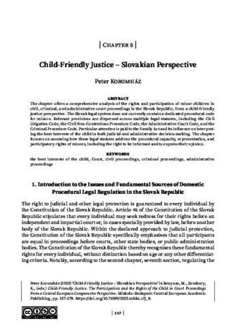 Koromház, Peter (2025) Child-Friendly Justice – Slovakian Perspective. In: Child-Friendly Justice. The Participation and the Rights of the Child in Court Proceedings From a Central European Comparative Perspective. Human Rights – Children’s Rights . Central European Academic Publishing, Miskolc, Budapest, pp. 157-178. ISBN 9786157027060; 9786157027053