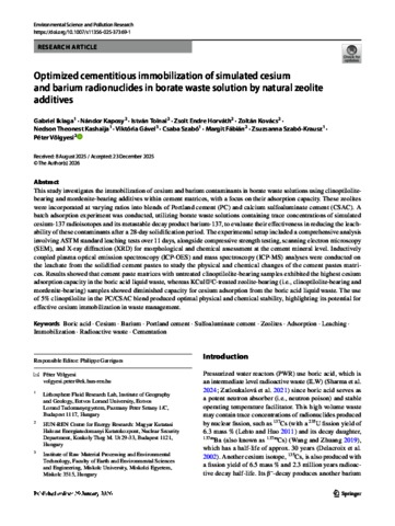 Iklaga, Gabriel Inalegwu and Kaposy, Nándor and Tolnai, István and Horváth, Zsolt Endre and Kovács, Zoltán and Kashaija, NT and Gável, V and Szabó, Cs and Fábián, Margit and Szabó-Krausz, Zsuzsanna and Völgyesi, Péter (2026) Optimized cementitious immobilization of simulated cesium and barium radionuclides in borate waste solution by natural zeolite additives. ENVIRONMENTAL SCIENCE AND POLLUTION RESEARCH. ISSN 0944-1344 (In Press)