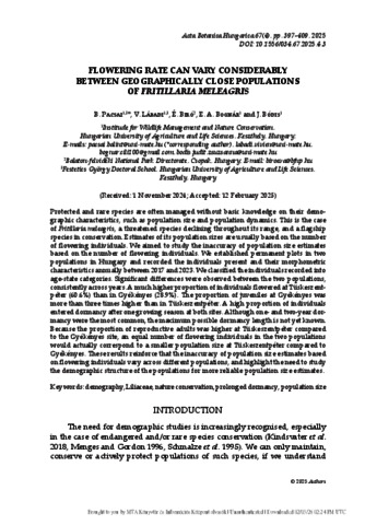 Pacsai, Bálint and Lábadi, Vivien and Biró, É. and Bognár, E. A. and Bódis, Judit (2025) Flowering Rate Can Vary Considerably Between Geographically Close Populations of Fritillaria Meleagris. ACTA BOTANICA HUNGARICA, 67 (4). pp. 397-409. ISSN 0236-6495