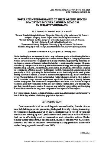 Zayani, N. E. and Miklósi, SZ. and Csergő, Anna Mária (2025) Population Performance of Three Orchid Species in a Drying Molinia Caerulea Meadow in Budapest (Hungary). ACTA BOTANICA HUNGARICA, 67 (4). pp. 503-516. ISSN 0236-6495