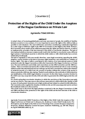 Agnieszka, Tomczewska (2025) Protection of the Rights of the Child Under the Auspices of the Hague Conference on Private Law. In: Child-Friendly Justice. The Participation and the Rights of the Child in Court Proceedings From a Central European Comparative Perspective. Human Rights – Children’s Rights . Central European Academic Publishing, Miskolc, Budapest, p. 269. ISBN 9786157027060; 9786157027053