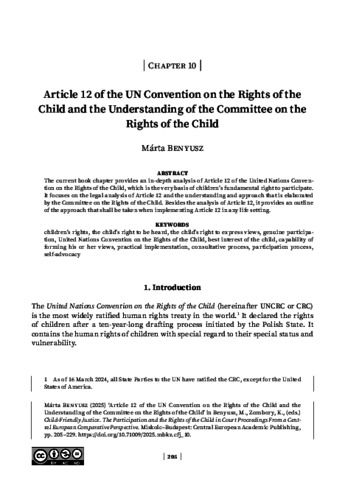 Benyusz, Márta (2025) Article 12 of the UN Convention on the Rights of the Child and the Understanding of the Committee on the Rights of the Child. In: Child-Friendly Justice. The Participation and the Rights of the Child in Court Proceedings From a Central European Comparative Perspective. Human Rights – Children’s Rights . Central European Academic Publishing, Miskolc, Budapest, pp. 205-229. ISBN 9786157027060; 9786157027053